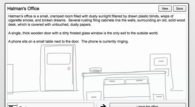 Second, I added a little visual element I've been meaning to do for a while: text feeding. Now, in area descriptions and interactions, the text comes in over time instead of all at once. I think it adds some visual flair to the application, and draws the eye to the descriptions rather than immediately to the buttons down below. I plan on having an options screen to control the speed of the text feed, but for now it's just one speed (which is pretty fast). You can also click the description to make the text load instantly.